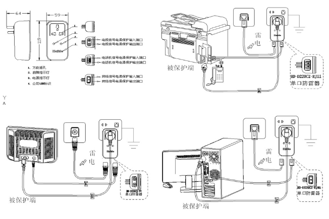 避雷器先插入供電插座,用電設(shè)備再?gòu)谋芾灼鞑蹇兹‰?,?qǐng)確保墻壁插座的地線有良好的接地(推薦接地電阻≤4Ω)。