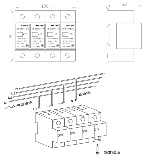 電源相線(L)、零線(N)分別接入電涌保護器相應接線端子,保證牢固及可靠,將避雷器接地端與防雷地線(推薦接地電阻≤4Ω)作良好電氣連接。