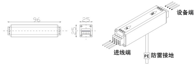 在被保護設(shè)備的線路接口前端串聯(lián)接入避雷器,“OUT”為設(shè)備端、“IN”為進線端,將避雷器接地端與防雷地線(推薦接地電阻≤4Ω)作良好的電氣連接。